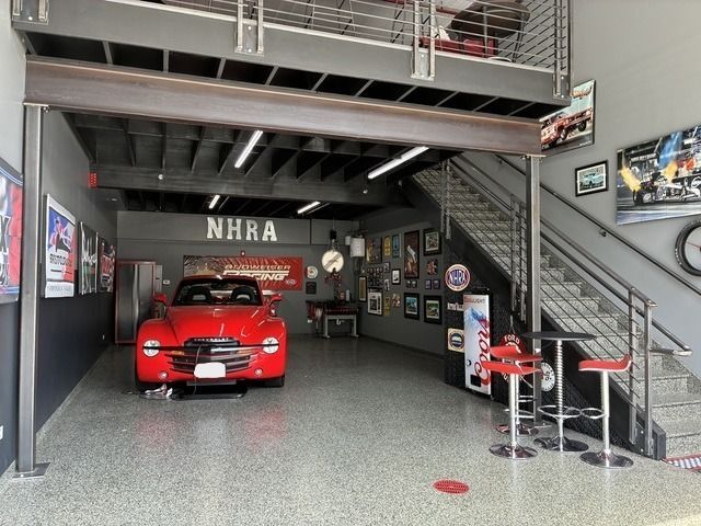 This customized car condo delivers a one-of-a-kind blend of storage and entertainment, highlighted by an additional 14' of mezzanine space that sets it apart from the rest. Become part of the vibrant Iron Gate community, surrounded by fellow enthusiasts who share your passion for cars and lifestyle. Natural light pours in through an added window above the entrance door complemented by a second window within the door itself-perfect for showcasing your collection in the best possible light. The garage level is thoughtfully equipped with radiant floor heating, a custom slop sink with hose reel, floor drain, refrigerator, storage and a sleek epoxy-coated floor. Upstairs, the expansive mezzanine is designed for both function and entertaining, featuring abundant kitchen and bar with storage, a sink, refrigerator, microwave, powder room and a generous open area ideal for hosting. This exceptional space is being offered furnished with the exception of the pub table with bar stools and the back-lit dragster artwork on the rear wall.