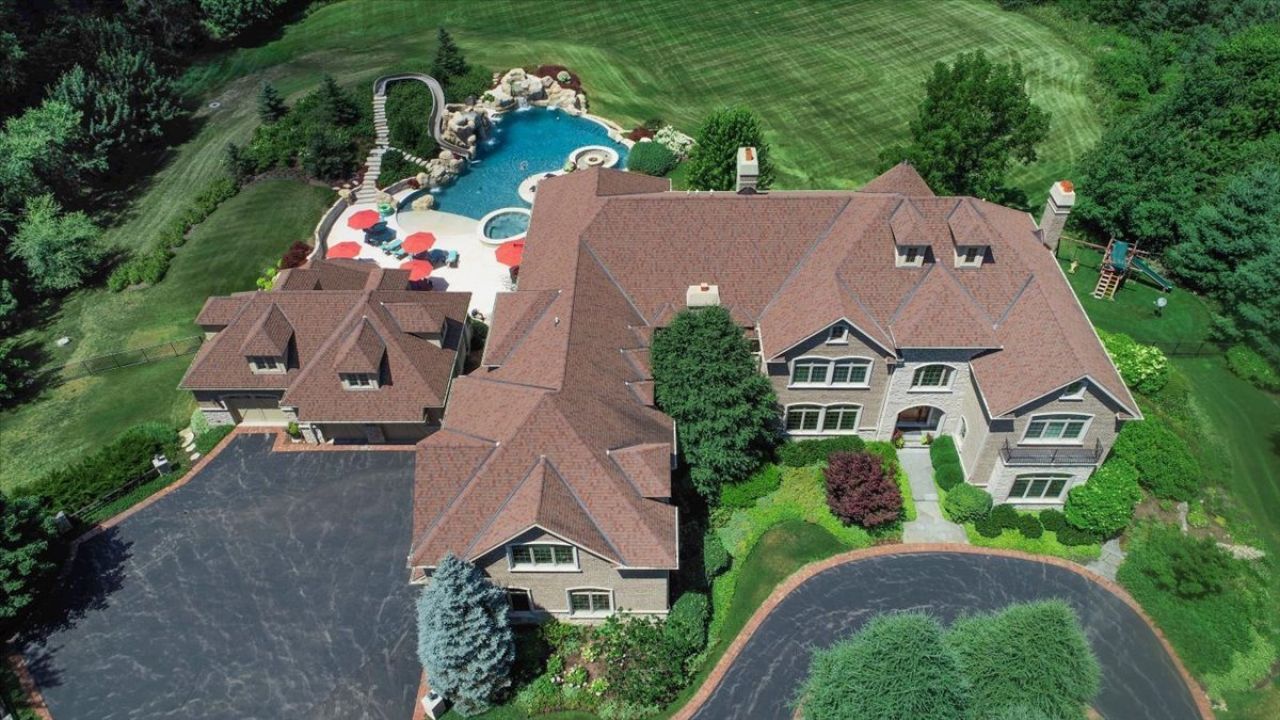 Prepare to be captivated by this extraordinary Bull Valley estate, where resort-caliber living meets unparalleled natural beauty. Set on over five private, breathtaking acres backing to the 608-acre Boone Creek Conservation Area, this one-of-a-kind property showcases sweeping panoramic views and a setting of complete serenity. Surrounded by rolling hills, equestrian estates, and scenic riding trails, Bull Valley is cherished for its bucolic charm and understated sophistication, an idyllic retreat offering both seclusion and convenience. This magnificent residence spans over 14,000 square feet of exquisitely finished living space, thoughtfully designed for both grand-scale entertaining and refined everyday living. Exceptional craftsmanship is evident throughout, with six bedrooms, six full and five half baths, four fireplaces, intricate millwork, arched passages, and designer finishes elevating every space. A grand foyer introduces elegant formal living and dining rooms, while the spectacular chef's kitchen features dual islands, premium appliances, and a sunlit breakfast room with seamless access to the screened porch and expansive deck, creating effortless indoor-outdoor living. Inviting gathering spaces include a warm, sophisticated family room, a secondary office, and a stunning screened porch with a tongue-and-groove ceiling and slate flooring, perfectly positioned to take in the surrounding landscape. For those who work from home, a dedicated first-floor executive office suite with private entrance, study, conference room, and bath offers a refined and highly functional workspace. The upper level is anchored by a luxurious primary suite retreat, with fireplace, private sitting room with wet bar, spa-inspired bath, an expansive walk-in closet, and private balcony and screened porch. Four additional ensuite bedrooms, a versatile bonus suite ideal for guests or au pair accommodations, and a second laundry room complete the level. The walkout lower level is nothing short of exceptional, featuring radiant heated floors, a game room, secondary family room with wet bar and wine cellar, a private theater with stadium seating for twelve, a fitness studio, and a remarkable indoor sports court with soaring 12-foot ceilings. Outdoors, the estate rivals the finest luxury resorts. A spectacular in-ground pool with three cascading waterfalls, dramatic slide, lazy river, and spa is complemented by a charming bridge leading to a sun deck with firepit. A fully appointed pool house with kitchen, changing area, and baths enhances entertaining, while multiple decks, dual screened porches, expansive patios, an outdoor shower, and a starlit firepit create unforgettable gathering spaces. Car enthusiasts will appreciate the six car capacity with both attached and detached garages, plus a carport with additional parking, ideal for collectors and hobbyists alike. Ideally situated near the renowned trails of Boone Creek Fen, the charming downtowns of Woodstock and Crys