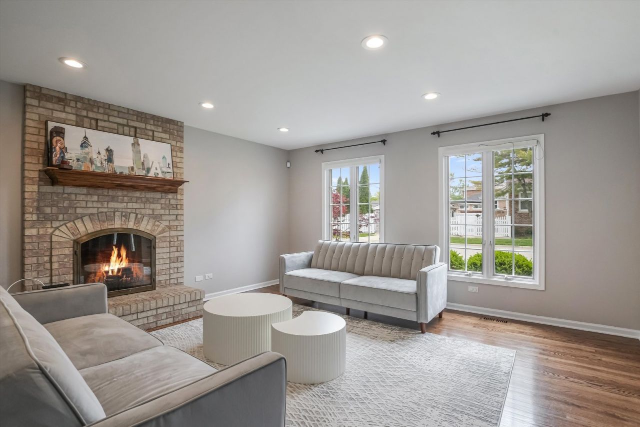 This stunning 4-bedroom, 3.5-bath brick home sits on a desirable corner lot and offers a stylish two-story layout perfect for families and entertaining. The main level features a spacious family room with a stone fireplace, open dining/living area, and a modern kitchen with island. The primary suite includes a walk-in closet and double-sink bath. A finished basement adds flexible living space, and the attached two-car garage offers added convenience. Enjoy the beautifully landscaped backyard designed for relaxation and gatherings.