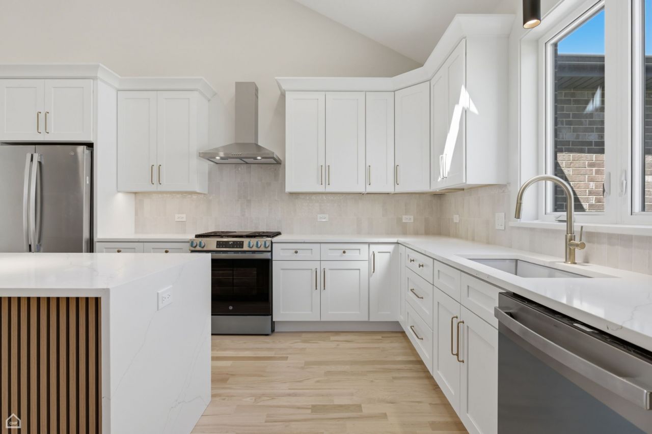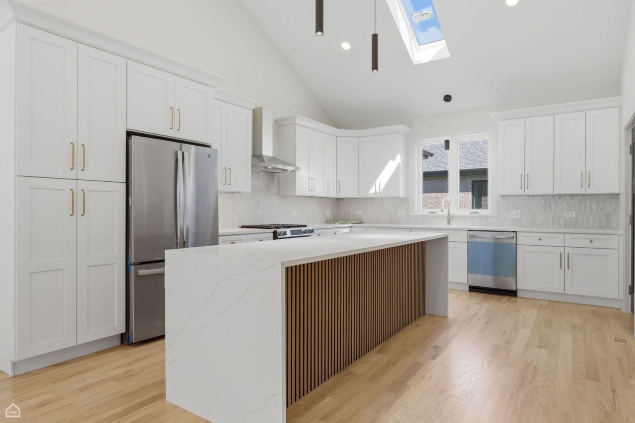New custom-built 5-bedroom, 3-bath split-level featuring 20-foot vaulted ceilings and oak hardwood floors. The open-concept main level includes a kitchen with an oversized island, stainless appliances, and skylights, with direct access to the backyard. The layout offers versatility with a main-level bedroom/office and a lower-level guest suite with a private full bathroom. The lower-level family room includes a floor-to-ceiling fireplace and custom built-in cabinets. Additional features: Side-by-side laundry room with sink and cabinets. **washer and dryer will be installed** Full sub-basement with 8 foot ceilings. 3-car garage. Home also comes with pre-installed, hardwired security cameras