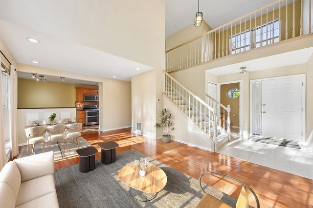 This stunning townhouse offers a turnkey living experience in an incredible location. With two generous bedrooms and a flexible loft space, this home adapts to your needs. Enjoy the luxury of a private entrance, a two-car garage, and excellent curb appeal. Inside, you'll be greeted by an open floor plan with soaring vaulted ceilings, abundant natural light, and an inviting, airy atmosphere. The chef-inspired kitchen features granite countertops, a stylish backsplash, ample cabinet storage, and a table space-ideal for cooking and entertaining. A convenient breakfast bar adds extra seating, while a glass slider opens to the private backyard with a patio and plenty of green space, perfect for relaxing or hosting outdoor gatherings. Upstairs, the loft offers endless possibilities-use it as a home office, playroom, workout space, or an additional living area. The primary bedroom is a peaceful retreat with a private bathroom, generous closet space, and serene views of the backyard. The second bedroom also boasts its own updated private bathroom, and the washer and dryer are conveniently located just down the hallway. The finished basement provides flexible space for an extra bedroom, family room, home gym, office, or recreation room-the choice is yours! Located near shopping, dining, entertainment, and with easy access to highways, Metra, and more, this home offers the perfect blend of convenience and privacy. Enjoy the proximity to parks, biking trails, and public transportation. Don't miss the opportunity to make this move-in ready home yours today!